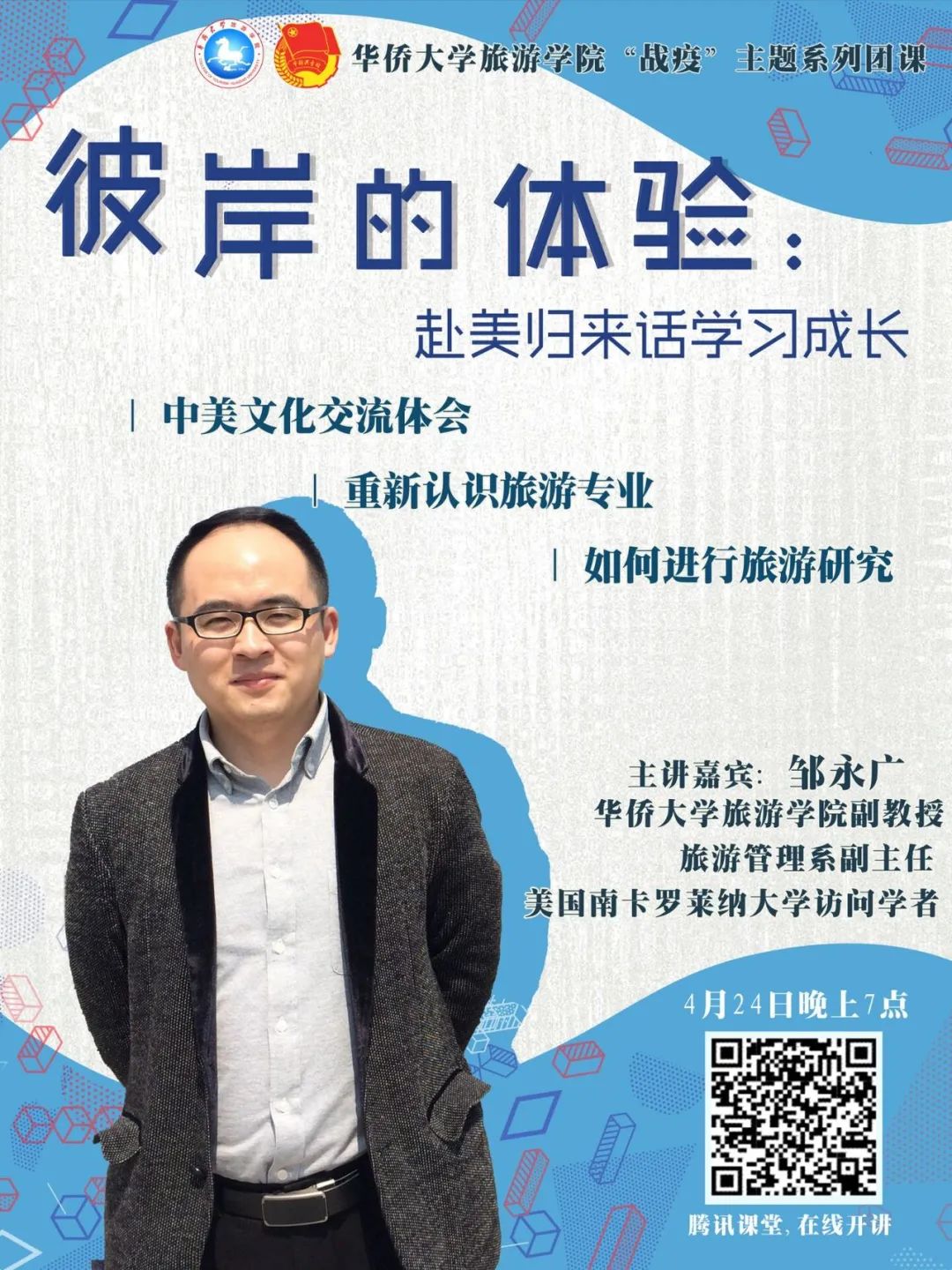 4月24日晚,旅游学院战疫系列主题团课第三讲继续在腾讯课堂在线开讲。华侨大学旅游学院旅游管理系副主任、美国南卡罗纳大学访问学者邹永广副教授作为主讲嘉宾,为全院团员青年开展了一场主题为“彼岸的体验:赴美归来话学习成长”的网络团课。