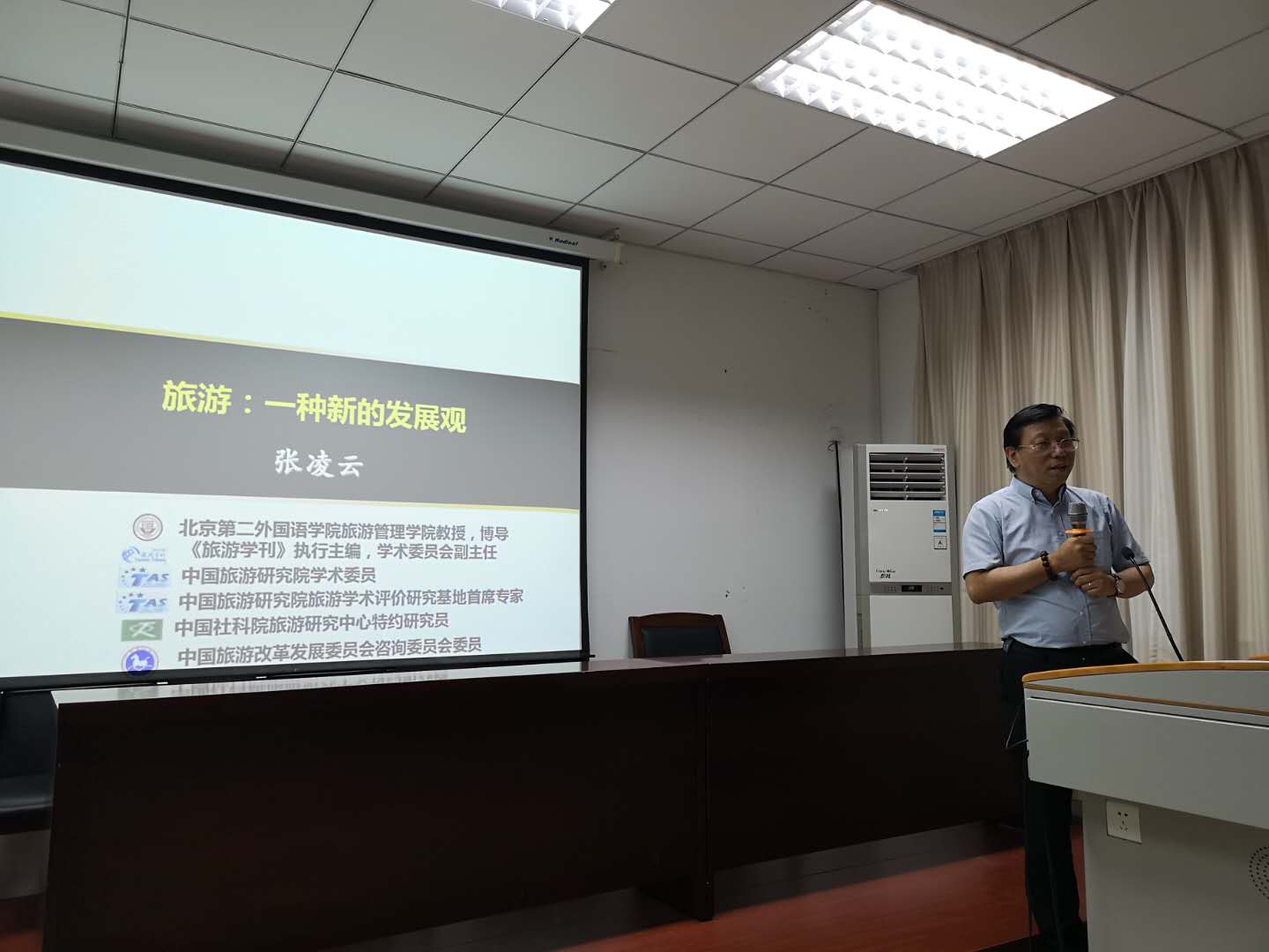 5月20日,北京联合大学旅游学院张凌云教授莅院讲学,主讲“旅游业:一种新的发展观”的专题讲座。我院学科带头人、博士生导师郑向敏教授出席讲座并主持,学院副院长谢朝武教授、中青年教师、硕博士生60余人到场聆听。