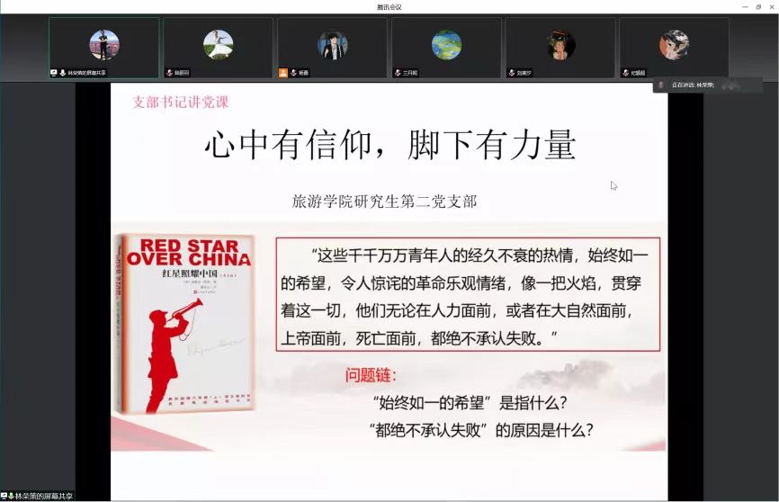 心中有信仰,脚下有力量。支部书记林荣策同志就本次主题作活动总结。他引用《红星照耀中国》:这些千千万万青年人经久不衰的热情,始终如一的希望,令人惊讶的革命乐观情绪,像一把火焰,贯穿着这一切,他们无论在人力面前,或者在大自然面前,死亡面前,都不会失败。因此,作为党员同志我们需要以先辈先烈为镜、以反面典型为戒,不断筑牢信仰之基、补足精神之钙、把稳思想之舵,以坚定的理想信念砥砺对党的赤诚忠心。