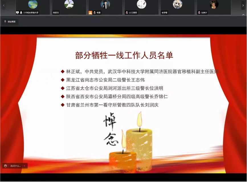 三年以来,新冠肺炎疫情反复侵袭,广大党员干部舍身忘死奋战一线,用无私逆行彰显大义,他们都是可歌可泣的抗疫英雄,值得我们缅怀纪念、并延续发扬这种战疫精神。支部书记林荣策同志带领支部党员默哀寄思,宣传委员兰丹妮通过多种形式回顾抗疫一线典型事迹,学习了张定宁、夏思思等党员干部在新冠疫情抗战中不顾安危、逆行出征,用生命守护群众生命健康的无畏精神。