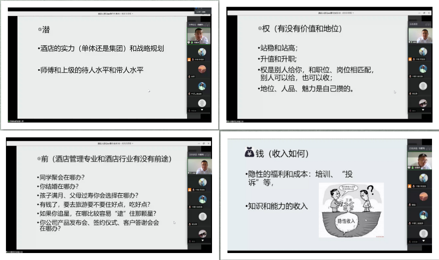 首先,李鹏辉介绍了自己的从业经历,并纠正了外界对酒店行业的误解,从不同角度对酒店各个部门进行了深入解读,为同学们选择酒店行业加油打气。紧接着,他从“权”、“前”、“钱”、“潜”等方面,提出了对“酒店人”素质的期待。