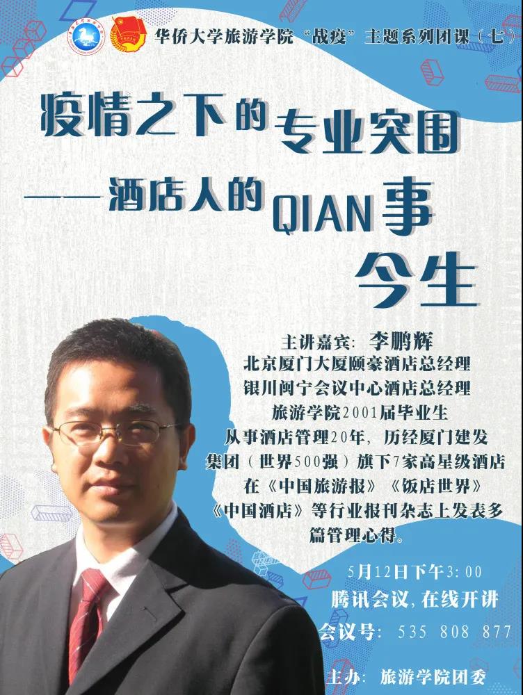 5月12日下午3点,我院举办了以“疫情下的专业突围——酒店人的Qian世今生”为主题的线上团课。本次团课邀请到旅游学院2001届毕业生、北京厦门大厦颐豪酒店总经理、银川闽宁会议酒店总经理——李鹏辉学长担任主讲嘉宾,吸引了百余名同学聆听。酒店管理系主任陈秋萍老师、系副主任王新建老师以及团委书记孙娟娟老师在线互动交流。