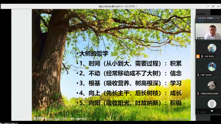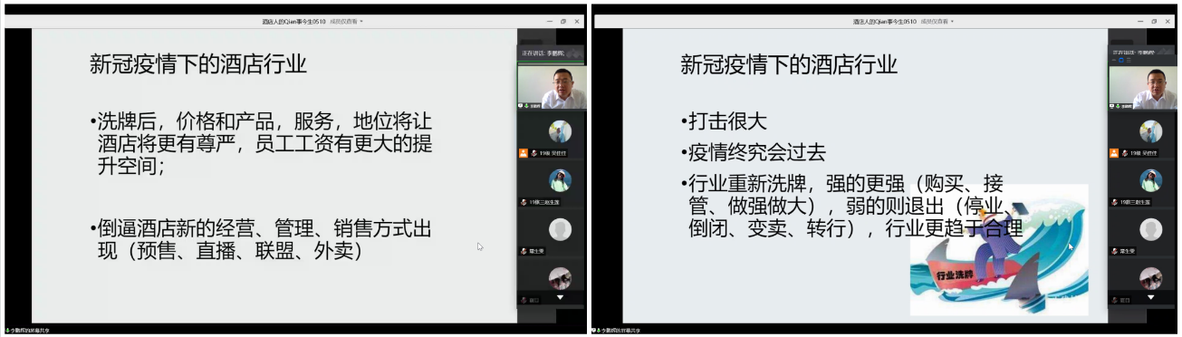 他点明,酒店行业其实是一个非常有前途的行业,它参与了人们出行、居住、庆祝、休闲等许多环节,是社会生活中不可缺少的部分。此外,从事酒店行业不仅对提升个人的人际交往能力有着巨大影响,而且对个人系统工作思维与技能的长足发展也有巨大的帮助。同时,李鹏辉强调,在疫情的危机下,酒店虽然面临着危险,但也存在着机遇。因此,酒店行业应该合理利用疫情机会,内在优化调整,外在顺应潮流,迎难而上、创新发展。