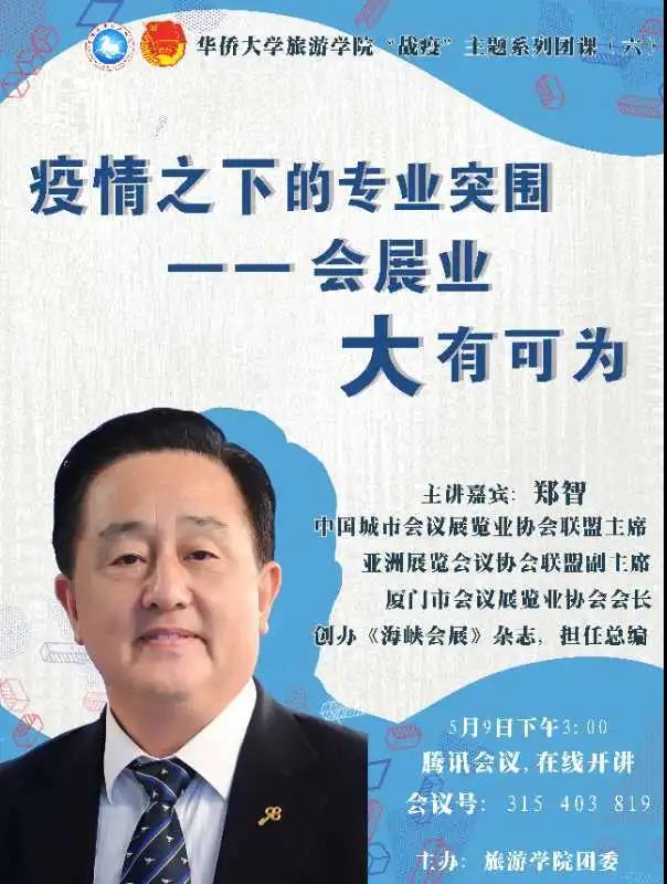 5月9日下午,我院举办了以“疫情之下的专业突围——会展业大有可为”主题网络团课。本次团课邀请到了中国城市会议展览协会联盟主席、亚洲展览会议联盟副主席、厦门市会议展览业协会会展、《海峡会展》的主编——郑智老师担任主讲嘉宾,在线为同学们解答有关会展专业的疑惑,吸引了百余名同学的聆听。讲座由会展经济与管理系主任张慧副教授主持。