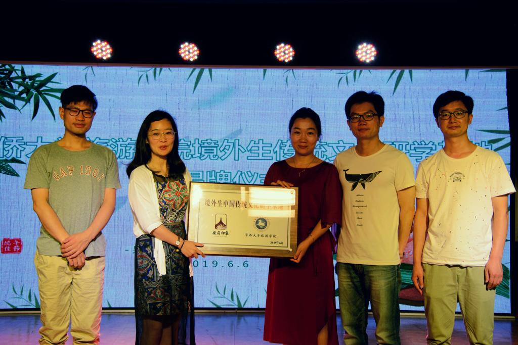 之后,在主持人的邀请下,孙娟娟老师等上台代表华侨大学旅游学院向泉府印象文化发展有限公司就“境外生传统文化研学基地”授牌,现场响起了热烈的掌声。